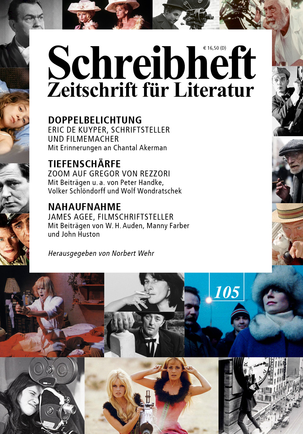 Schreibheft 105 widmet sich dem Film und nimmt zunächst den belgischen Filmemacher Eric de Kuyper (*1942), dessen Kindheitserinnerungen An der See 2024 in der Übersetzung von Gerd Busse bei Wagenbach erschienen sind, und die Regisseurin Chantal Akerman (1950-2015) in den Blick, die seit den späten 60er Jahren vielfach und intensiv zusammengearbeitet haben. Neben amüsanten und dekuvrierenden Anekdoten aus der Filmwelt von Los Angeles in den späten 70er Jahren besticht vor allem Esther Kinskys Essay "Eine Reise ins Herz des Schweigens. Chantal Akermans D'Est". Der Film versammelt Eindrücke, die die Regisseurin Anfang der 90er Jahre bei mehreren Reisen gen Osteuropa in 16 mm aufgezeichnet hat. Kinsky bekennt: "D'Est ist mein Lieblingsfilm von Chantal Akerman, vielleicht wegen der Abwesenheit von Sprache. Er lehrt sehen, das Hinschauen, ohne die Distanz, die Vergegenwärtigung der Fremdheit des Blicks aufzugeben." Bewundernswert, wie Kinsky allein mit Worten einen Film aufs Plastischste zu evozieren vermag, der schweigend allein vom Schauen handelt.